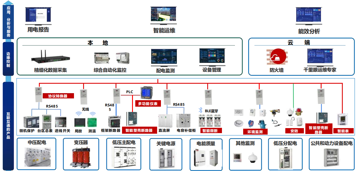 智能配電監(jiān)測系統(tǒng)對配電數(shù)據(jù)集中采集、存儲和遠程管理,實現(xiàn)配電的智能化管理運維,同時對各級能耗進行在線監(jiān)測和統(tǒng)計,提供用能數(shù)據(jù)分析等服務(wù),保障安全、可靠、科學(xué)、經(jīng)濟、綠色用電。